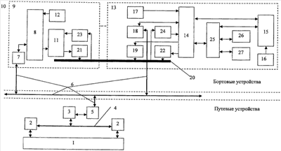 Блок 25 сопряжения осуществляет формирование по уровню и передачу сигналов между микропроцессорным блоком 15 центрального управления аппаратурой последнего вагона 13, вагонным блоком 14 контроля целости состава поезда 10, а также блоком 26 электронной регистрации и блоком 27 ультразвукового контроля рельсов. Микропроцессорный блок 15 центрального управления аппаратурой последнего вагона непрерывно осуществляет диагностику автономного источника питания, который для надежности резервирован и снабжен буфферной аккумуляторной батареей (не показаны). Благодаря надежному автономному источнику питания 16 последний вагон 13 поезда при отрыве от состава сохраняет связь по радиоканалу 6 цифровой связи и способен передавать свои координаты в диспетчерский центр управления 3 и бортовому устройству управления 8 локомотива 9 своего поезда 10, что способствует оперативному устранению аварийной ситуации.