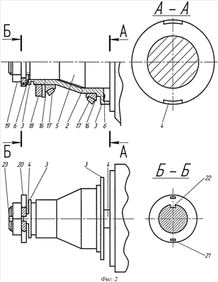 Выступы 4 наружных фланцев втулок ступенчатые и узкими концами входят в периферийные осевые сквозные отверстия 21 шайб 20 крепления втулок на осях 5 колес, причем длина узкой части выступов меньше толщины этих шайб. В центральных отверстиях шайб имеются радиальные выступы 22, входящие в осевые канавки 23 на осях колес.