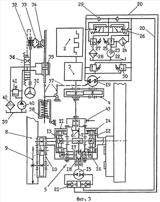Описывать работу направляющих, регулирующих, предохранительных и контура подпитки устройств объемного гидропривода нет необходимости, так как в данном изобретении выполняет вспомогательную роль, специалисту по гидроприводу понятна из схемы на фиг.3 и соответствует рекомендациям справочной литературы, например, по [3], с.277, рис.7.20.