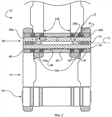 Узел 30 картриджа по фиг.2 представлен в соответствии с одним из нескольких возможных вариантов выполнения настоящего раскрытия. Каждое звено 15 гусеницы обычно выполнено идентично и может включать в себя наборы из внутренних звеньев 15b и внешних звеньев 15а. Каждый набор из внутренних и внешних звеньев может быть соединен вместе с внешним или внутренним звеньями соседних звеньев гусеницы через узел 30 картриджа. В частности, внутренние звенья 15b могут быть соединены с элементами 36а и 36b вкладышей, например, путем установки на них с прессовой посадкой, и внешние звенья 15а могут быть соединены с муфтами 44а и 44b также, например, с использованием прессовой посадки. Элементы 36а и 36b вкладышей могут иметь несколько больший внешний диаметр, чем муфты 44а и 44b. Внешние звенья 15а обычно отделены от внутренних звеньев 15b относительно малым зазором “Z” так, что звенья 15а и 15b могут вращаться относительно друг друга во время работы, по существу, без контакта между ними, как описано ниже.