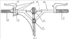 Руль 2 оснащен ручками 39 управления, поворотными вокруг своей оси на трубках 40, проходящих в боковых рулевых патрубках 41. На концах трубок 40 в средней части, напротив рулевой колонки укреплены две направляющие катушки 21 блока 20, каждая из которых управляется своей ручкой 39. Например, на левой стороне патрубка 41 посредством фланца установлена защелка-фиксатор 42. На левом патрубке размещен штифтер 36 для управления защелкой-фиксатором 35. На рулевой колонке с внутренней стороны закреплены, например, три ролика 43 (или катушки обгонной муфты) блока 20. Таким образом, ручки 39, штифтер 36, защелка-фиксатор 35, защелка-фиксатор 42, блок 20 образуют органы управления транспортным средством.