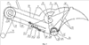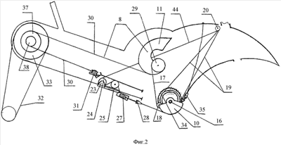 При подаче усилия на одну из педалей 7, натягивается ветвь 17 гибкой тяги, нижний ее конец, закрепленный на секторе 10 роликом 18, остается неподвижным, а верхний – поворачивает сегмент 11, который набегая на ветвь 30, поворачивает одну из катушек 37 прямого хода обгонной муфты. В это время соединенная с ней катушка 38 обратного хода наматывает ветвь 30 гибкой тяги через блок 31, возвращая в исходное положение соседние катушки 37, 38, а также сегмент 11.