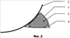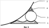 На Фиг.3 показан второй вариант конструкции элемента обводов, выполненного как надувной элемент определенного сечения и формы, где 1 – гибкая оболочка надувного элемента, 2 – поверхность корпуса лодки, 3 – эластичный, пористый материал заданного поперечного сечения с открытыми проницаемыми порами, 4 – элемент(ы) из гибкого и(или) эластичного материала, соединенный с надувным элементом и формирующий заостренные углы элемента обводов.