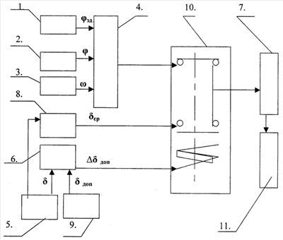 В результате судно выйдет на курс, равный заданному значению зд. Регулярно через интервал времени Т подключается блок перегрузки 6. В случае развитого морского волнения может наступить перегрузка рулевого привода. Рассмотрим эту ситуацию. Судоводитель устанавливает в задатчике перегрузки 9 предельно допустимое значение загрузки рулевого привода недоп., которое поступает на вход блока перегрузки 6, на второй вход этого блока поступает угол перекладки руля от датчика угла перекладки руля 5. В блоке перегрузки 6 рулевого привода формируется величина перегрузки рулевого привода  недоп.: