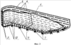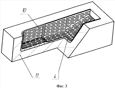 Изготовление каркасов из армирующих материалов деталей летательного аппарата из композиционного материала при традиционных методах происходит в следующей последовательности. В матрицу без щелевых прорезей 1 (фигура 1) послойно укладывается армирующий материал 2 и одновременно производится пропитка связующим 3, после чего создается давление прессование и температура, при которых происходит полимеризация связующего. Формирование каркасов 4 (фигура 2) в матрицу 5 со щелевыми сквозными щелями 6 с перемычками 7 в стенках 8 притягиванием каркасов 4 технологическими петлями 9 к перемычкам 7 с последующей прошивкой их волокнами 10 через щели 6 матриц 5 обеспечивает скрепление слоев сухого материала каркасов в состоянии, приближенном к положению слоев в готовом изделии. Затем технологические петли 9 срезают, извлекают каркасы 4 из матриц 5 со щелями 6, пропитывают их связующим, устанавливают в формующую матрицу 11 (фигура 3), выполняют операцию полимеризации, затем извлекают их из формующих матриц 11. При этом в процессе полимеризации используются известные способы создания давления прессования и прижима пропитанных связующим материалов каркасов 4 к матрицам 11, например, эластичным мешком.