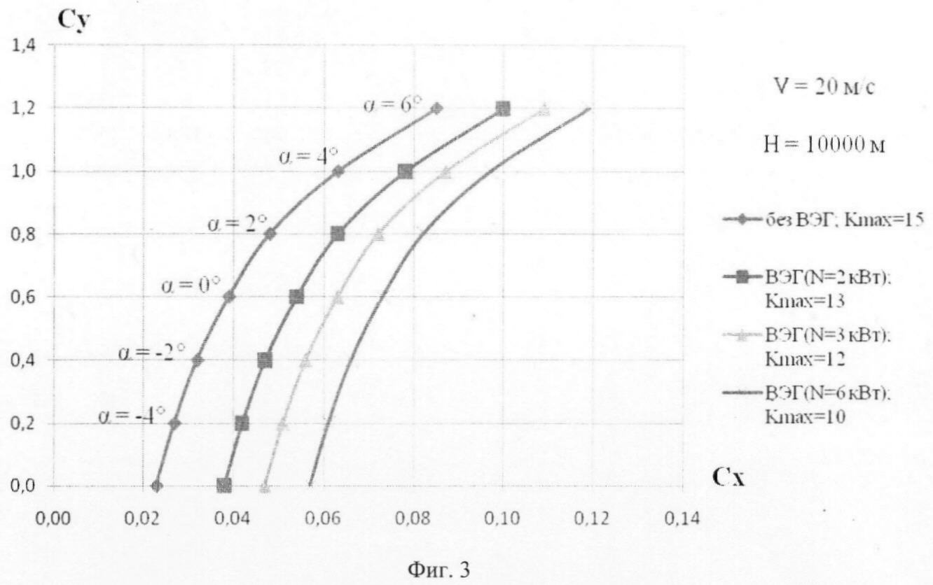 На фиг.3 представлены поляры летательного аппарата при вариациях мощности ветроэлектрогенератора.