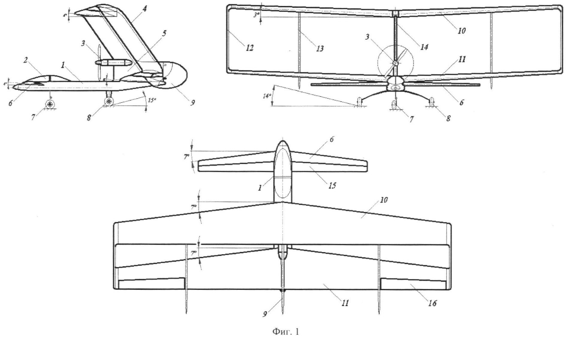 По форме консоли крыльев биплана 4 и переднего горизонтального оперения 6 подобны, с высоким удлинением и одинаковой стреловидностью =7°. Крепление консолей крыльев биплана и переднего горизонтального оперения к фюзеляжу 1 и центроплану вертикального стабилизатора 14 осуществлено с положительным заклинением, причем верхнее крыло 10 биплана имеет дополнительный угол заклинения по отношению к нижнему крылу 11.