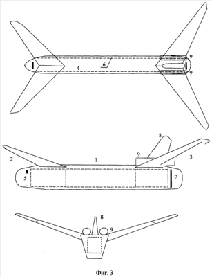 В фюзеляже установлены четыре антенны – две боковые 4 и 6, передняя 5 и задняя 7. На фюзеляже находится киль 8 и двигатели 9.