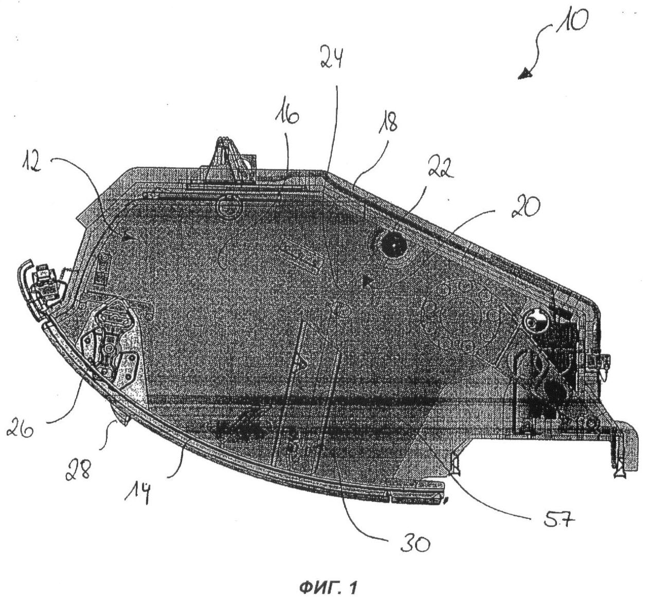 Верхняя багажная полка 10, показанная на Фиг.1 и 2, содержит опускаемую крышку 12, которая включает в себя основание 14 и две противоположные боковые стенки 16. Опускаемая крышка 12 может поворачиваться из верхнего закрытого положения, показанного на Фиг.1, в котором она принимается в корпусе 18 верхней багажной полки, в нижнее открытое положение загрузки или разгрузки, показанное на Фиг.2. Корпус 18 верхней багажной полки жестко прикреплен к потолочной конструкции пассажирского отсека самолета, которая на чертежах не показана.
