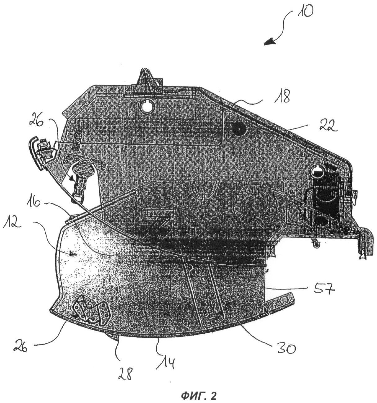 Как можно видеть на Фиг.1-3, каждое устройство аварийного открытия 30, установленное на боковых стенках 16 опускаемой крышки 12, частично окружено закрывающим элементом 57, прикрепленным к соответственной боковой стенке 16. Как лучше всего видно на Фиг.3, закрывающий элемент 57 скомпонован таким образом, что это не сказывается на активировании рычага 42 запорного устройства 34. На закрывающем элементе 57 сформировано окошко, что позволяет проверять рабочее состояние устройства аварийного открытия 30 без необходимости демонтажа закрывающего элемента 57.