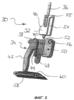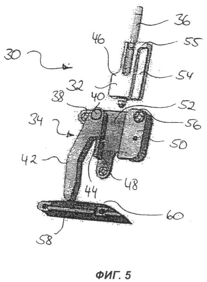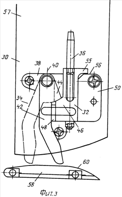 И наконец, устройство аварийного открытия 30 содержит блок скольжения 58 для скользящего направления плоского объекта, который, как будет описано в дальнейшем, может быть использован для перемещения поворотного рычага 42 запорного устройства 34 между его первым и вторым положениями. Блок скольжения 58 присоединен к выступу (не показан), который проходит, по существу, перпендикулярно наружной стороне боковой стенки 16 опускаемой крышки 12 и расположен так, что при смещении между своим первым и вторым положениями рычаг 42 скользит по поверхности 60 блока скольжения 58. В качестве альтернативы блок скольжения 58 устройства аварийного открытия 30 может быть сформирован как одно целое с закрывающим элементом 57 или же прикреплен к нему.