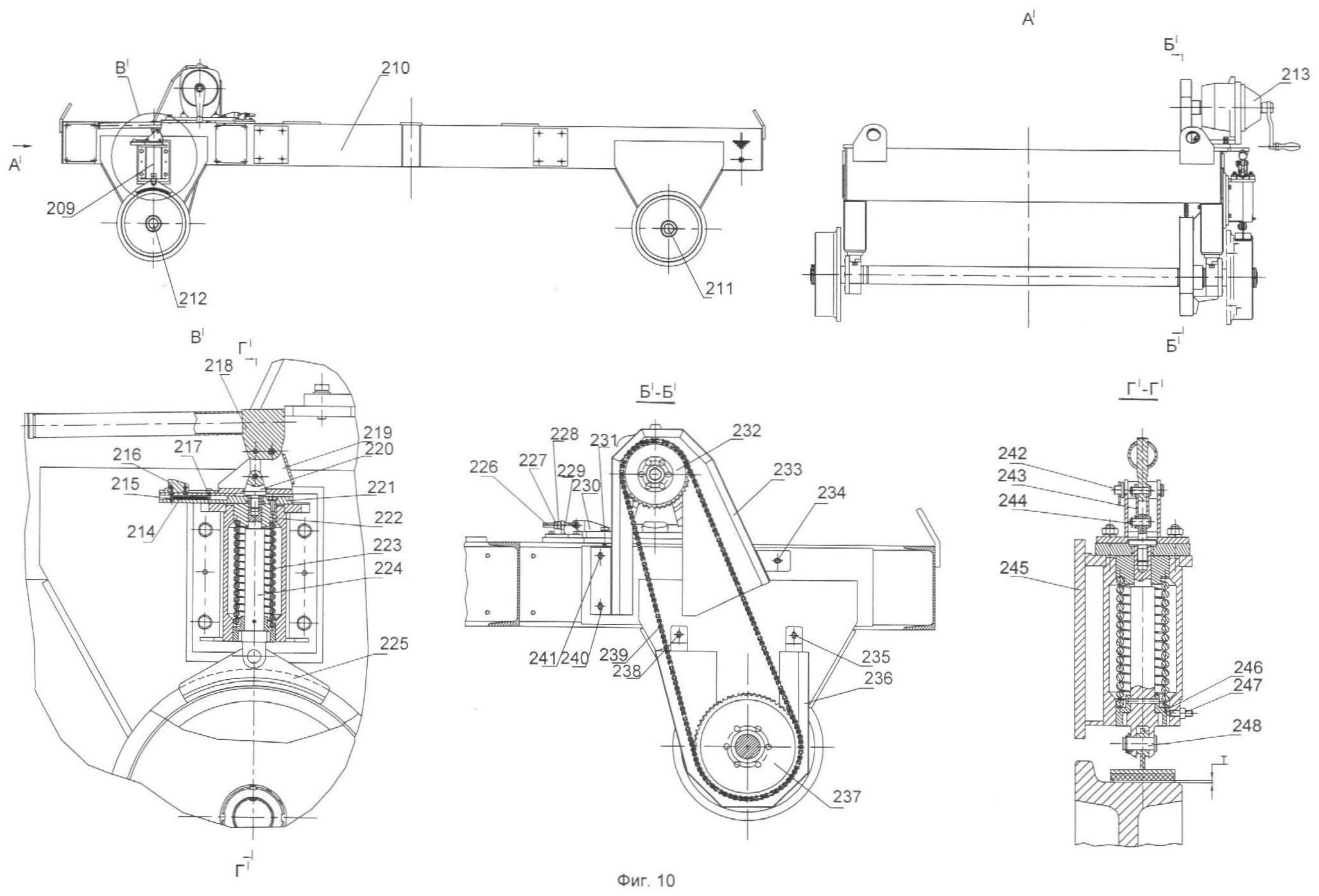 На фиг.10: Ходовая тележка стенда: 209 – тормоз; 210 – рама ходовой тележки; 211 – вал ведомый; 212 – вал ведущий; 213 – редуктор; 214, 223 – пружина; 215, 217 – штифт; 216 – фиксатор; 218 – рукоятка; 219 – кронштейн; 220 – ушко; 221 – корпус фиксатора; 222, 246 – упор; 224 – шток; 225 – колодка тормозная; 226, 247 – винт; 227 – контргайка; 228 – гайка; 229 – кронштейн натяжного устройства; 230 – плита опорная; 231, 234, 235, 238, 240, 241 – болт; 232 – звездочка ведущая; 233 – кожух верхний; 236 – кожух нижний; 237 – звездочка ведомая; 239 – цепь; 242, 244, 248 – ось; 243 – тяга; 245 – корпус тормоза.