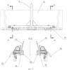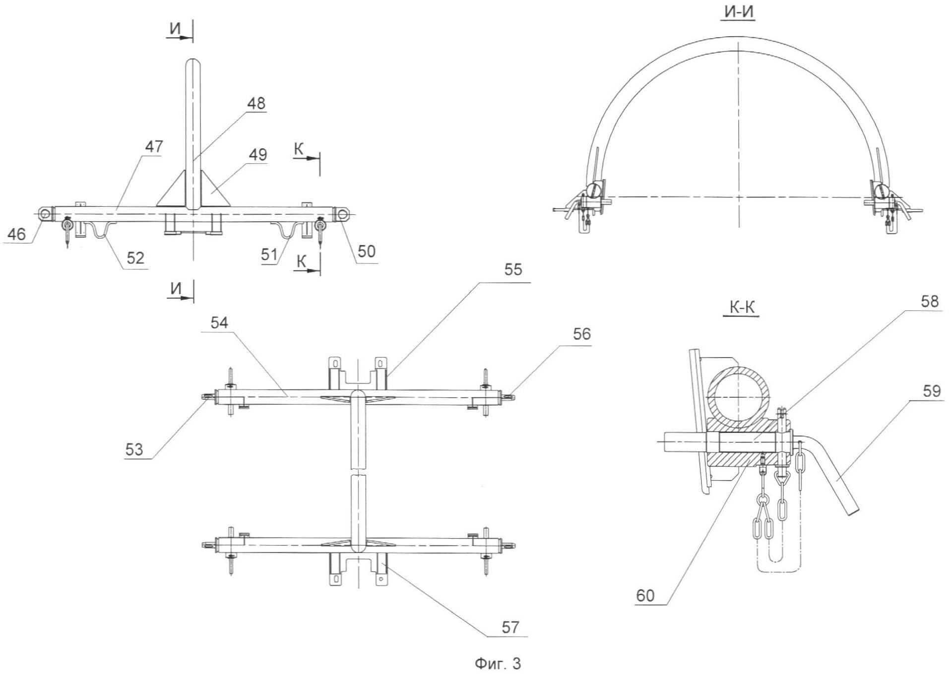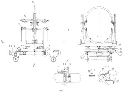 Снизу на поперечных балках рамы 4 (фиг.1) смонтированы опоры 36 (фиг.2) по две с каждой стороны, имеющие сложную геометрическую опорную поверхность. Этими опорами рама 4 (фиг.1) установлена на колеса 32 (фиг.2) рамы 7 (фиг.1). При этом реборды колес 32 (фиг.2) являются направляющими для опор 36 (фиг.2).