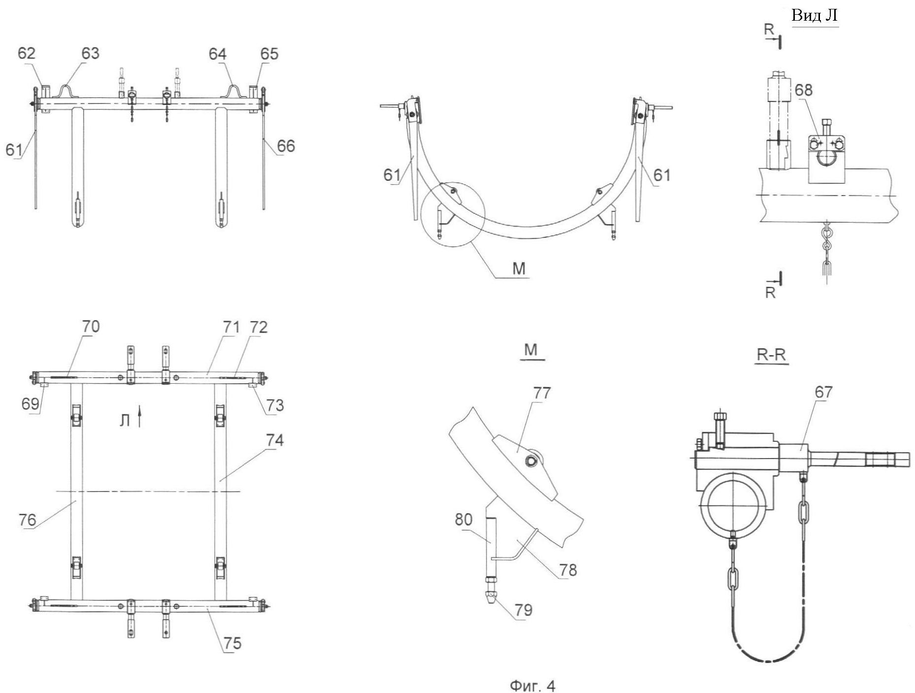 На фиг.4: Нижний корсет стенда: 61, 66 – рычаг (парный); 62, 65, 69, 73 – упор; 63, 64, 70, 72 – ушко; 67 – лапа съемная; 68 – планка; 71, 75 – балка; 74, 76 – скоба дугообразная нижнего корсета; 77 – кронштейн; 78 – опора; 79 – винт прижимной; 80 – вал;