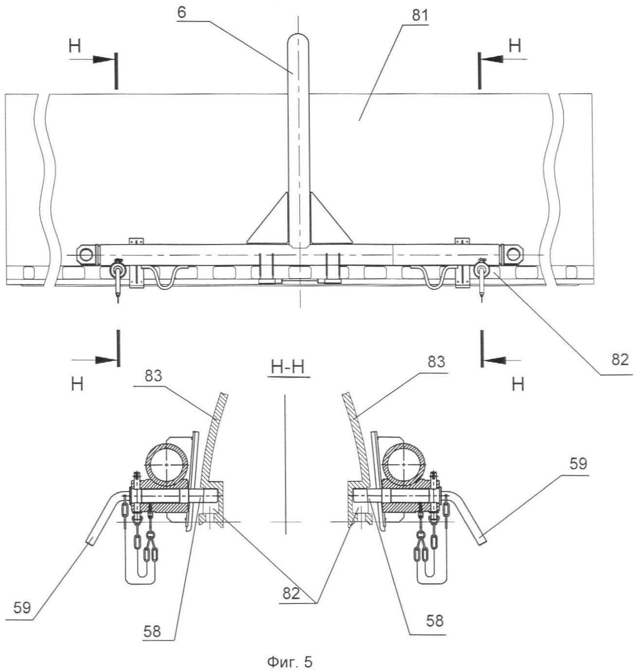 На фиг.5: Узел стыковки верхнего корсета с верхним обтекателем: 81 – верхняя створка обтекателя; 82 – пазы верхней створки обтекателя для стыковки с фиксаторами верхнего корсета; 83 – корпус верхней створки обтекателя;