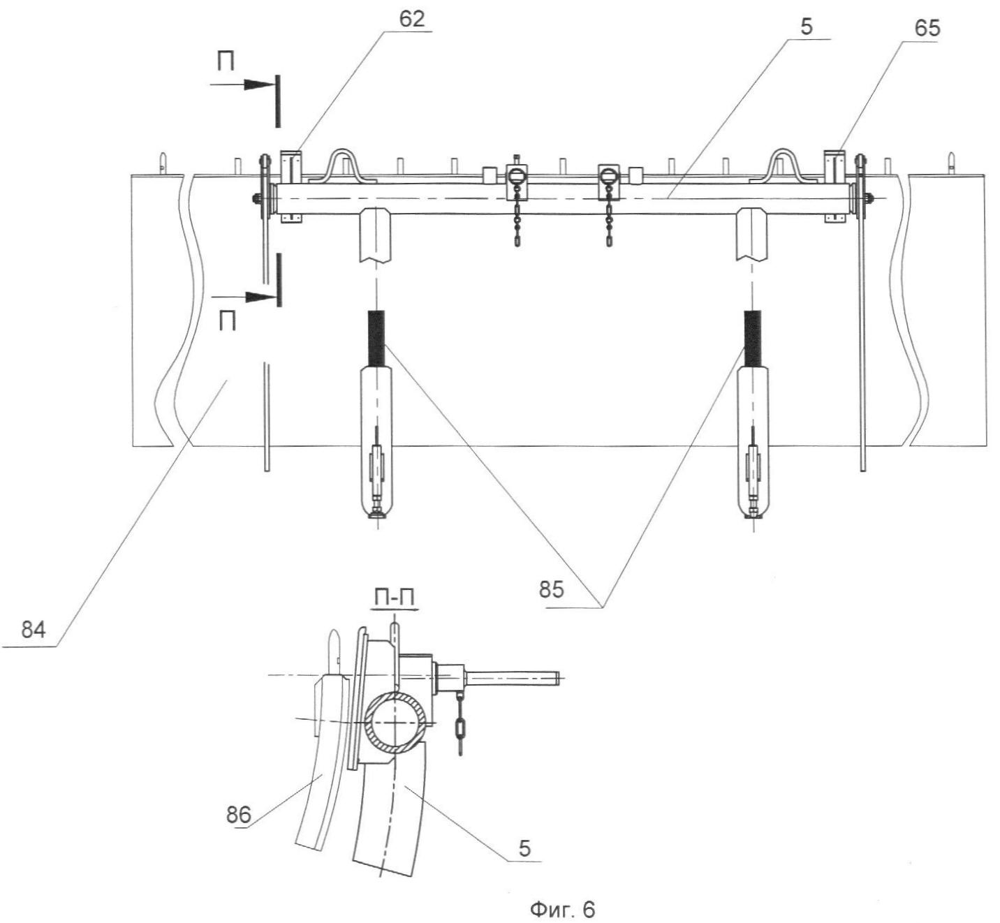 В рабочем (опорном) положении лапы 67 устанавливают в отверстия опор, приваренных к балкам рамы нижнего корсета. В этом положении лапы фиксируют стопорными винтами, при этом планки 68, закрепленные на опорах, предотвращают осевой проворот лап 67.