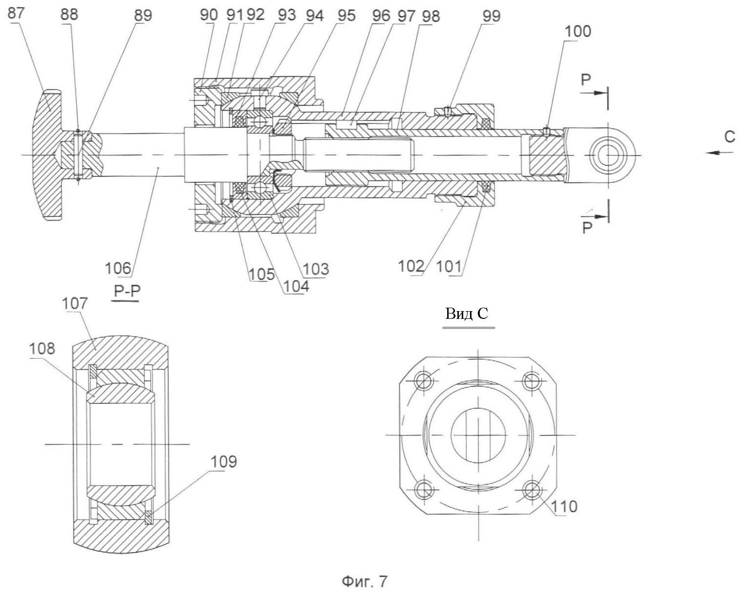 Шпонка 94, установленная в отверстии корпуса 96 и заведенная во внутреннюю проточку стакана 91, ограничивает возможность проворота корпуса 96 в стакане 91. В корпусе 96 на шариковом подшипнике 103 установлен винт 106, на резьбовой наконечник которого навинчен шток 98. В торцевое отверстие штока 98 ввинчено ушко 107 в сборе со сферическим подшипником 108. При вращении винта 106 происходит линейное перемещение штока 98 в корпусе 96. При этом шпонка 97, установленная на штоке 98 и заведенная во внутреннюю проточку корпуса 96, служит направляющей деталью для штока, а также ограничивает возможность его проворота. На концевой части винта 106 установлен приводной маховик 87.