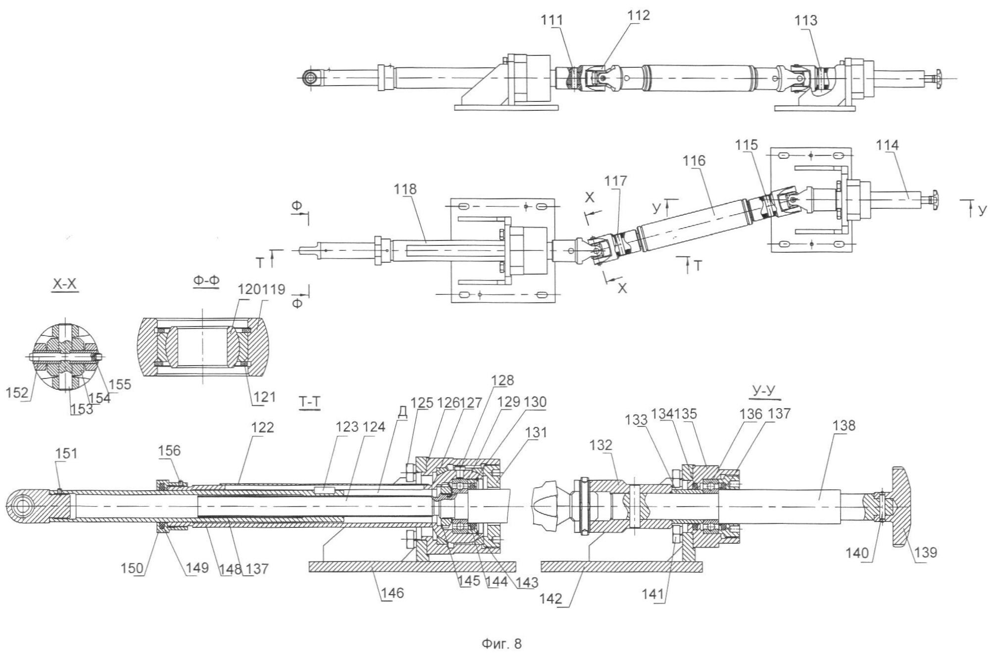 На фиг.8: Механизм продольного проворота рамы относительно изделия: 111, 113, 115, 117, 140, 152 – штифт; 112, 132 – муфта шарнирная; 114 – привод; 116 – вал промежуточный; 118 – механизм винтовой; 119 – ушко; 120, 129, 136 – подшипник; 121, 134, 143, 144, 149 – кольцо; 122 – накладка; 123, 128 – шпонка; 124, 151, 156 – винт; 125, 141 – болт; 126, 135 – стакан; 127 – вкладыш; 130 – шайба; 131, 137, 145, 150 – гайка; 133, 155 – втулка; 138 – вал; 139 – маховик; 142, 146 – кронштейн; 147 – шток; 148 – корпус; 153 – палец; 154 – крестовина;