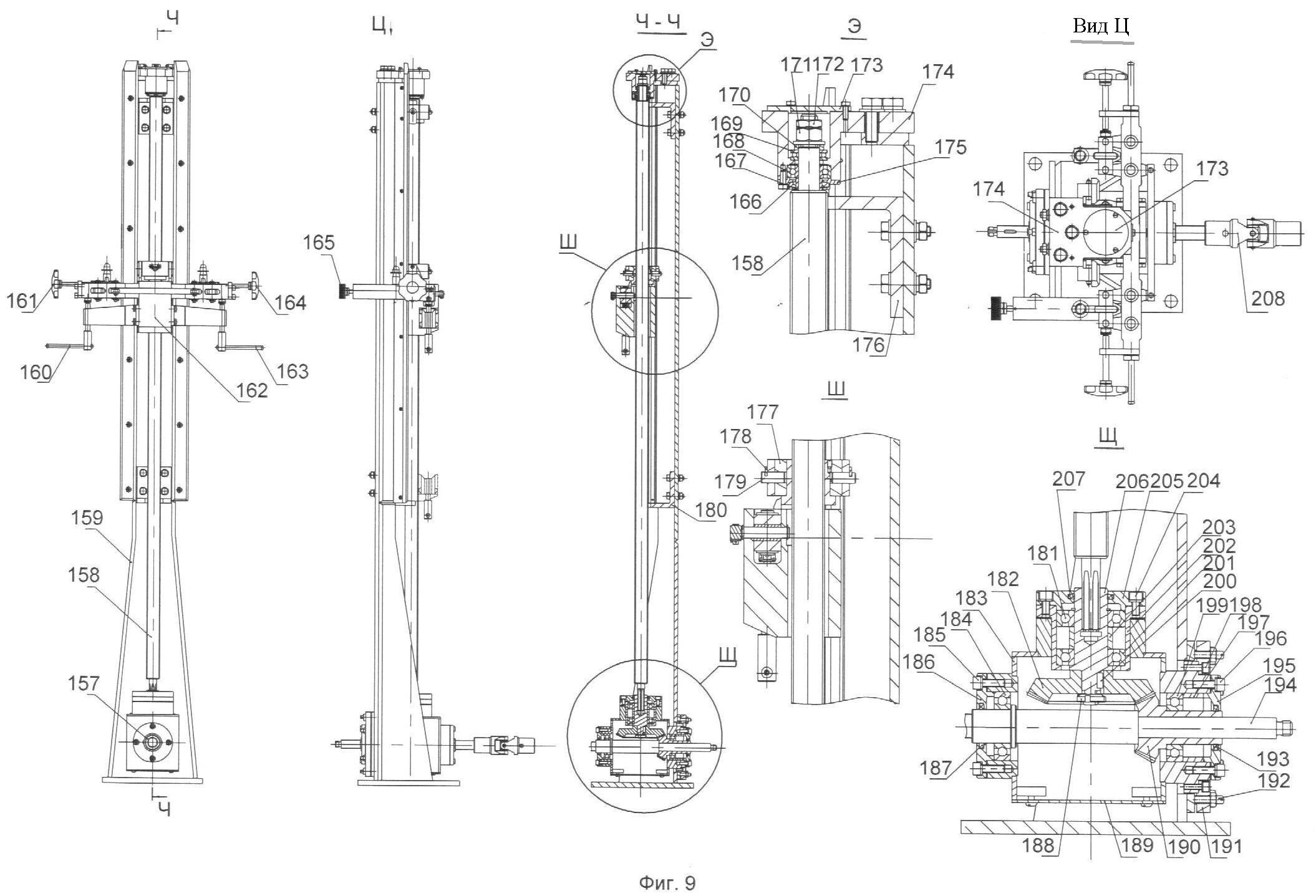 На фиг.9: Подъемный механизм рамы: 157 – привод; 158 – винт ходовой; 159 – стойка; 160, 163 – рукоятка; 161, 164 – маховик; 162 – каретка; 165 – ручка; 166, 187, 193, 207 – кольцо; 167, 170, 197, 203 – втулка; 168, 169 – подшипник; 171, 172, 188 – гайка; 173, 175, 186, 189, 195, 205 – крышка; 174 – стакан; 176, 180 – упор; 177 – гайка в сборе; 178 – оседержатель; 179 – ось; 181, 184, 199, 201 – подшипник; 182 – колесо; 183