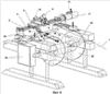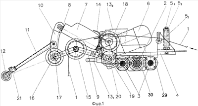 На этой же фигуре показан энкодер 26, закрепленный на станине станка соосно ходовому винту траверсы, который служит для перевода оборотов ходового винта в линейное перемещение каретки раскладчика, а также механические ограничители 27 хода каретки, предусмотренные для аварийного случая.