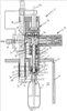 Канал 8 выполнен аналогично обычному гидравлическому каналу, выполненному в разливных элементах, и впадает на нижней стороне 6.1 корпуса 6 в кольцеобразное выпускное отверстие 22, охватывающее элемент 13 трубы, в котором предусмотрен второй гидравлический клапан 23, закрытый при опущенном поршне 12. Для гидравлического клапана 23 нижний конец поршня 12 выполнен как корпус 24 клапана, взаимодействующий с выполненной в направлении канала 8 рядом с выпускным отверстием 22 поверхностью клапана.