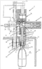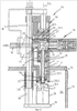Канал 7 частично образован открытым с обоих концов каналом 12.1 трубообразного, определяющегося своей осью ось FA разливочного элемента поршнем 12, переходящим в нижней стороне 6.1 корпуса в элемент 13 трубы, с расположенным в нем газовым затвором 13.1 и образующим короткую разливочную трубку для наполнения свободной струей. Газовый затвор 13.1 представляет собой в самом простом варианте вставной блок в виде сита с большим количеством отверстий или же вставной блок, имеющий большое количество каналов, открывающихся соответственно к каналу 12.1 поршня, а также к образующему выпускное отверстие для жидкого разливаемого продукта нижнему концу элемента 13 трубы. Верхним концом канал 12.1 поршня впадает в камеру 14 клапана гидравлического клапана 15, через который камера 14 клапана, а вместе с ней также и канал 12.1 поршня могут управляемо соединяться с точкой разветвления обоих каналов 7 и 8 или с соединительным каналом 9. Гидравлический клапан 15 состоит из управляемого посредством приводного устройства 16 корпуса 17 клапана, перемещаемого в представленной форме выполнения для открытия и закрытия гидравлического клапана 15 на ход клапана в перпендикулярном к оси FA разливочного элемента и тем самым радиально ориентированном в направлении к оси машины и взаимодействующего с соответствующей поверхностью 18 клапана.