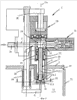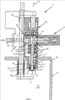 фиг.1. Разливочный элемент разливочной машины ротационной конструкции вместе с присоединенным к этому разливочному элементу держателю емкости или бутылок, упрощенное изображение, вид в разрезе;