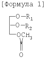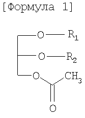 В Реакции 1 R1, R2 – это остатки жирных кислот, содержащие 16-22 атомов углерода и отличающиеся друг от друга, P – тритильная или триалкилсилильная группа в качестве защитной группировки. Алкил в триалкилсилильной группе содержит 1-5 атомов углерода. Тритильная группа может быть замещенной или незамещенной; предпочтительный вариант триалкилсилильной группы – трет-бутилдиметилсилил. Соединения в Реакции 1 могут быть рацемическими или оптически активными. Как показано в Реакции 1, для того чтобы получить производное 1-R1-2-R2-3-ацетилглицерол с Формулой 1, во-первых, получают 1-R1-3-(защитная группа)-глицерол с Формулой 3 путем введения защитной группировки (Р) в 3-е положение 1-R1-глицерола с Формулой 2. 1-R1-глицерол с Формулой 2, являющийся исходным веществом в Реакции 1, может быть рацемическим или оптически активным. Соединение для введения защитной группы должно избирательно защищать первичную спиртовую группу, и защитная группа не должна влиять на реакцию ацетилирования в ходе удаления защиты. Примеры соединений для введения защитной группы включают тритилхлорид или трет-бутилдиметилсилилхлорид; предпочтительное количество соединения для введения защитной группы составляет 1-1,1 эквивалента относительно 1-R1-глицерола с Формулой 2. Если количество соединения для введения защитной группы меньше 1 эквивалента, реакция защиты может протекать неэффективно, а если количество соединения для введения защитной группы больше 1,1 эквивалента, в реакцию может вступать гидроксильная группа во 2-м положении производного глицерола. Когда в качестве защитной группы используется тритил, 1-R1-3-(защитная группа)-глицерол с Формулой 3 может быть предпочтительно получен в присутствии пиридина в качестве растворителя или в присутствии неполярного апротонного органического растворителя и органического основания. Когда используется пиридин, он служит одновременно и растворителем, и основанием; предпочтительна температура реакции 40-60°С. При температуре ниже 40°С реакция может протекать неэффективно; при температуре выше 60°С тритильная группа может включаться во 2-е положение глицерола. Предпочтительное количество пиридина составляет 5-10 эквивалентов относительно 1-R1-глицерола с Формулой 2. Когда используются органический растворитель и органическое основание, предпочтительная температура реакции – от 0°С до комнатной. Примеры неполярного апротонного органического растворителя включают дихлорметан, тетрагидрофуран, этилацетат и их смеси; примеры органического основания включают триэтиламин, трибутиламин, 1,8-диазабицикло[5,4,0]-7-ундецен (DBU) и их смеси. Предпочтительное количество органического основания – 1-2 эквивалента относительно 1-R1-глицерола с Формулой 2; предпочтительное количество органического растворителя 5-10-кратно (по объему) относительно веса 1-R1-глицерола с Формулой 2 (т.е. 5-10 мл/г). Когда количество пиридина или органического растворителя меньше вышеприведенного диапазона, может оказаться трудно перемешивать реакционную смесь; превышение вышеприведенного диапазона количества пиридина или органического растворителя нежелательно по экономическим соображениям, а дополнительных преимуществ не дает. Кроме того, когда количество органического основания меньше 1 эквивалента относительно 1-R-1-глицерола, реакция может протекать неэффект