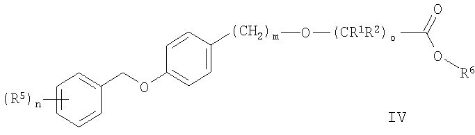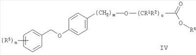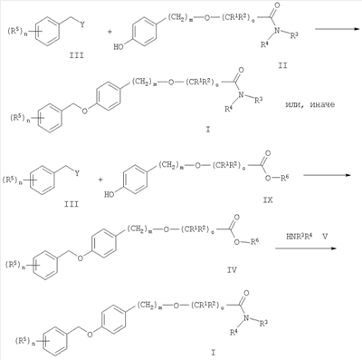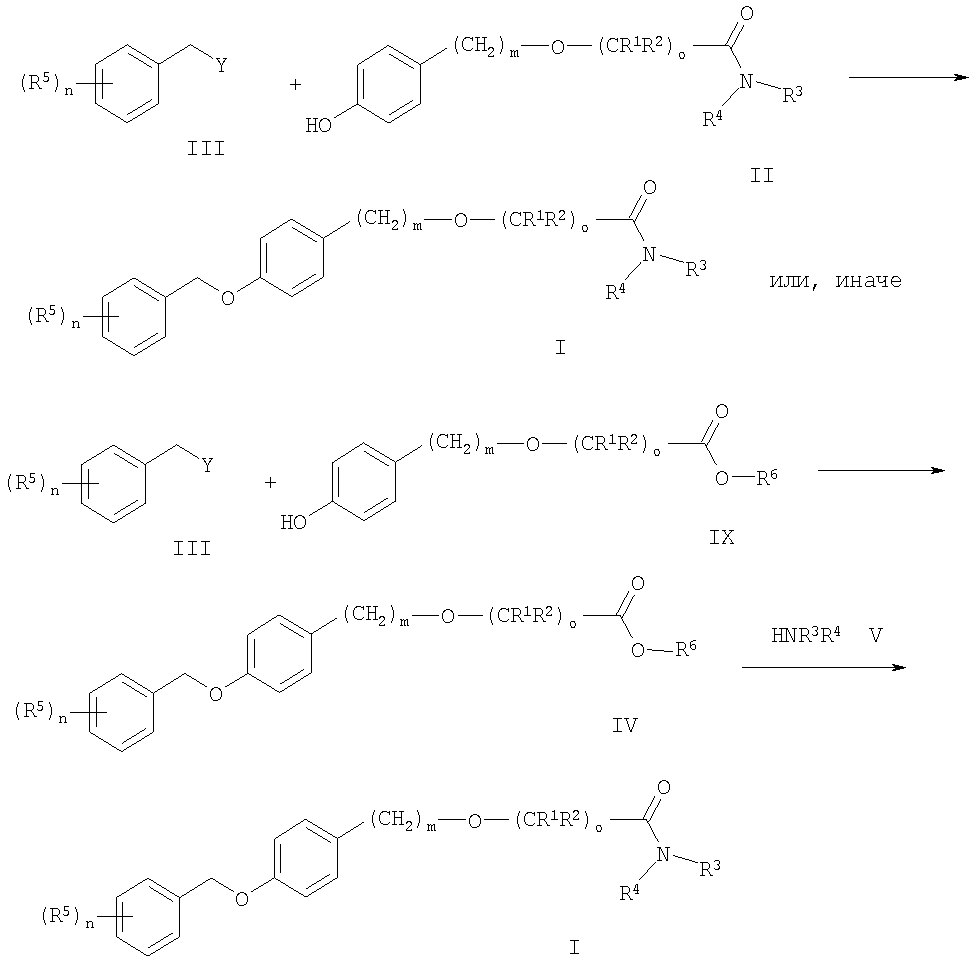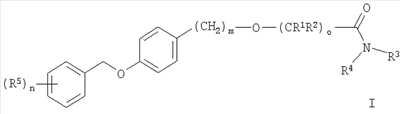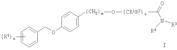 2. Соединения формулы I по п.1, где о представляет собой 1 и m представляет собой 0, за исключением 2-[4-(фенилметокси)фенокси]ацетамида, 2-[4-[(4-хлорфенил)метокси]фенокси]-2-метил-пропионамида и 2-[4-[(4-хлорфенил)метокси]фенокси]-2-метил-N-(1-метилэтил)пропионамида, а также при условии, что исключены соединения общей формулы (I), где один из R1 или R2 представляет собой C1-С6-алкил, а другой представляет собой Н; R3 и R4 представляют собой Н; n, m представляют собой 0; и о представляет собой 1.