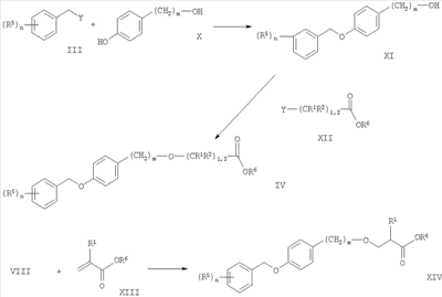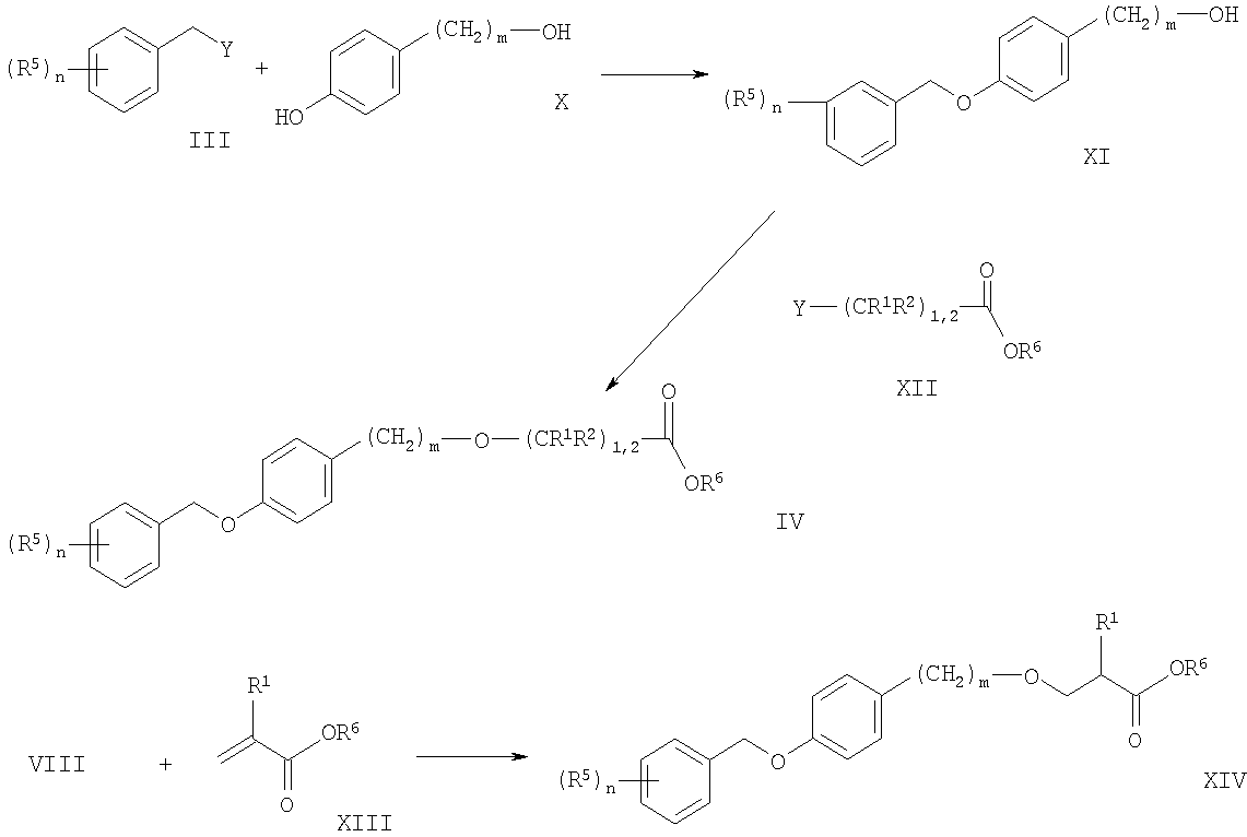 На схеме 2 показан способ получения промежуточных соединений для соединений формулы I. Аналогично процедурам, описанным ранее, моно-алкилирование фенола Х с бензильными галогенидами, тозилатами, мезилатами или трифлатами формулы III по реакции синтеза эфиров Вильямсона приводит к гидроксильным производным формулы XI. Другой способ представляет собой взаимодействие бензиловых спиртов формулы III с соответствующими фенолами формулы Х по реакции сочетания Мицунобу. Обычно реакцию проводят в инертных растворителях, например в диэтиловом эфире или тетрагидрофуране, используя диалкилазодикарбоксилаты, в присутствии фосфинов (например трибутил- или трифенилфосфина). Соединения формулы XI можно далее алкилировать под действием сложноэфирных производных формулы XII с получением соединений формулы IV. Данную реакцию алкилирования также можно проводить при уже описанных ранее условиях, в основном, хорошо известных квалифицированному специалисту в данной области.