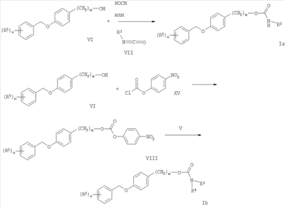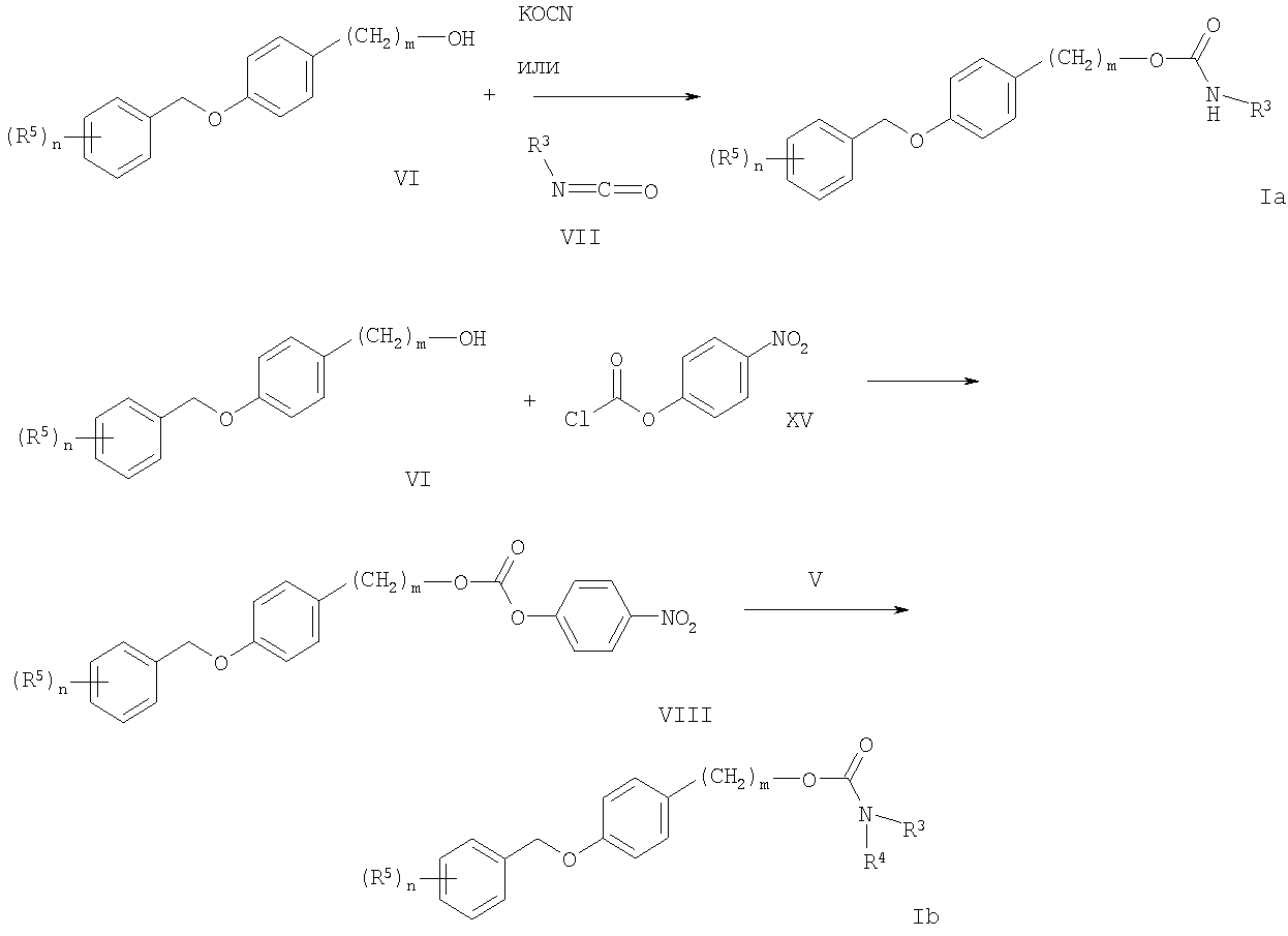 Заместители, n и m имеют вышеописанные значения. На схеме 3 показано получение соединений формулы Ia и Ib, где n=0. Реакция гидроксильных производных формулы VI с цианатом калия или алкилизоцианатами в герметичных сосудах с использованием растворителей подобных дихлорметану или толуолу при температуре от комнатной до 100°С приводит к образованию карбаматов формулы Ia.