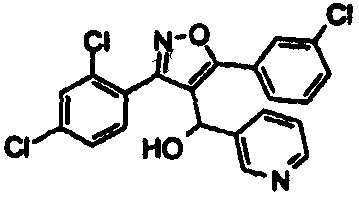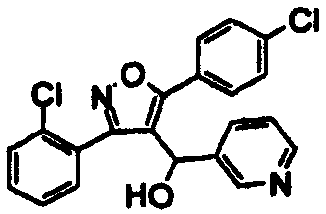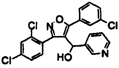К раствору 80 мг (0,19 ммоль) 5-(2-хлорфенил)-3-(2,4-дихлорфенил)-4-[(3-пиридил)карбонил]изоксазола в 3 мл этанола при 0°С добавляли 40 мг (1,06 ммоль) борогидрида натрия. Смесь перемешивали в течение 2 ч и затем разбавляли этилацетатом. Этилацетатный раствор промывали насыщенным раствором хлорида натрия и сушили над сульфатом магния. Осушитель отфильтровывали и этилацетат удаляли на роторном испарителе. Неочищенный продукт очищали препаративной ТСХ, получая 65 мг (0,15 ммоль) 5-(2-хлорфенил)-3-(2,4-дихлорфенил)-4-[(3-пиридил)гидроксиметил]изоксазола. 1Н ЯМР (СDCl3): 5,80 (уш.с, 1), 6,97 (м, 1), 8,23 (уш.с, 1) и 8,28 м.д. (уш.с, 1). МС m/z: 431,0 (M+H).