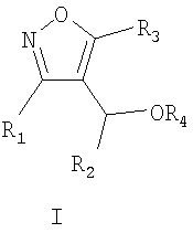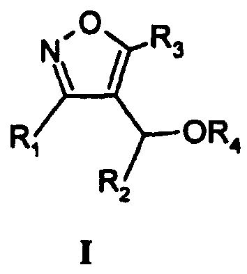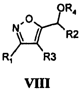 Изоксазолы, где R4 не является H, получают из соединения I (R4=H) в стандартных условиях ацилирования или карбамоилирования. Например, ацетатное производное I (R4=COCH3) синтезируют из спирта I (R4=H) взаимодействием с уксусным ангидридом и пиридином в эфирном растворителе при комнатной температуре в течение ночи. Ацилирование можно проводить с использованием либо ангидридов кислот (например, ангидрид уксусной кислоты, ангидрид пропионовой кислоты), либо хлорангидридов кислот (например, бензоилхлорид) в присутствии органического основания в инертном растворителе (например, простой эфир, дихлорметан). Реакции карбамоилирования осуществляют обработкой спиртов I сильным основанием, таким как гидрид натрия, затем карбамоилхлоридом (например, N,N-диметилкарбамоилхлорид) в инертном растворителе, таком как ДМФА (диметилформамид).