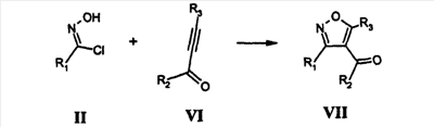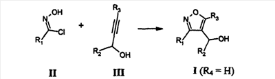 Способы получения. Соединения общей структуры I, где R4 означает H, могут быть получены [3+2]циклоприсоединением карбоксимидоилхлорида II к ацетиленовому карбинолу III: