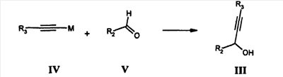 Ацетиленовые карбинолы III получают присоединением металлорганического производного ацетилена IV (M=Li, MgX; X=Cl, Br) к альдегиду R2CHO (V), как показано ниже: