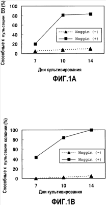 Периодически определяют процент EB, способных к спонтанной пульсации, как удобный показатель дифференциации и развития клеток ES в кардиомиоциты. Если клетки EB3 используют в качестве клеток ES и культивируют в суспензии с плотностью 1×102 клеток/мл, очень небольшое количество EB, полученных из клеток ES, не обработанных Noggin (группа Noggin(-)), способно к пульсации даже после 14 дней культивирования (фиг.1А). С другой стороны, пульсацию наблюдают у EB, полученных из клеток ES, обработанных Noggin (группа Noggin(+)), начиная с 7-го дня культивирования в суспензии, а на 14 день пульсацию наблюдают у 80 или более % EB. такую же тенденцию наблюдают у клеток, культивированных в суспензии в концентрации 2×105 клеток/мл, причем, в конечном счете, пульсация наблюдается менее чем у 10% EB в группе Noggin(-) и у 30% или более в группе Noggin(+) на 10 день и у 90% или более на 14 день. У EB Noggin(-) пульсация наблюдается в некоторых ограниченных участках, тогда как у EB Noggin(+) пульсация неожиданно наблюдается во всех участках поверхностного слоя.