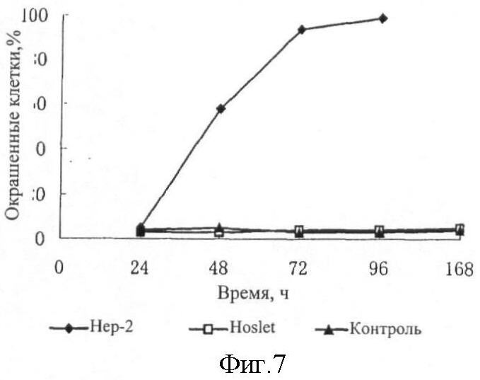 12. Влияние продолжительности и дозы рекомбинанта аденовируса р53 на трансфекцию клеток Нер-2 и H1299 в течение 36 ч после того, как было осуществлено инфицирование клеток Нер-2 и H1299 рекомбинантом аденовируса р53. Исследование обращало внимание на различное влияние рекомбинанта ДНК на цитолиз клеток Нер-2 и H1299 при разной дозировке указанного рекомбинанта и разной продолжительности инфицирования. Клетки окрашивали синим фенольным красителем и проводили подсчет погибших клеток. Полученные результаты показаны на фиг.6 и на фиг.7.