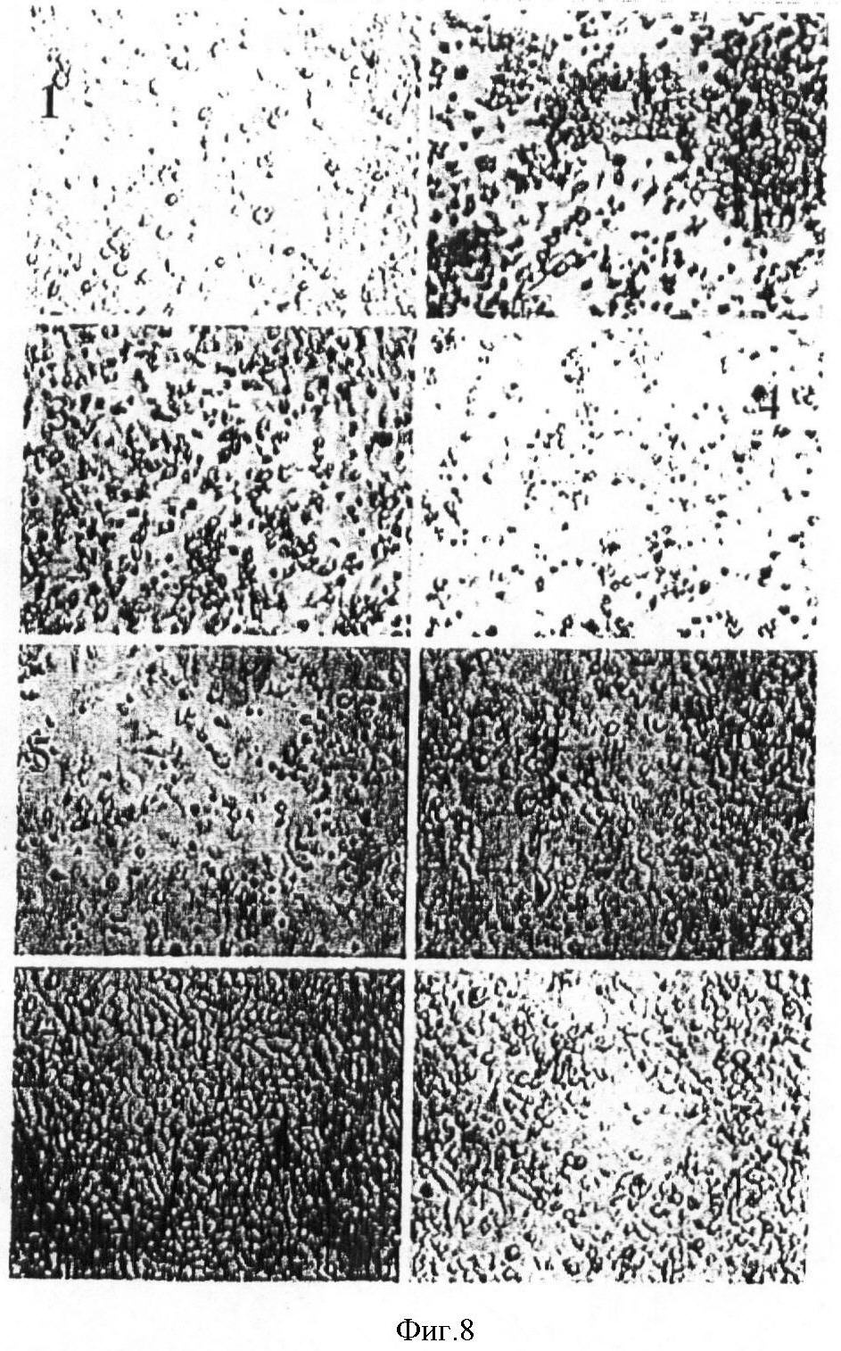На фиг.8 показаны микрофотографии клеток Hep-2 спустя 36 ч после того, как их инфицировали рекомбинантом р53 аденовируса. 1 – контроль; 2 – MOI 200; 3 – MOI 150; 4 – MOI 100; 5 – MOI 50; 6 – MOI 10; 7 – вирус GFP MOI 200; 8 – вирус GFP MOI 150;