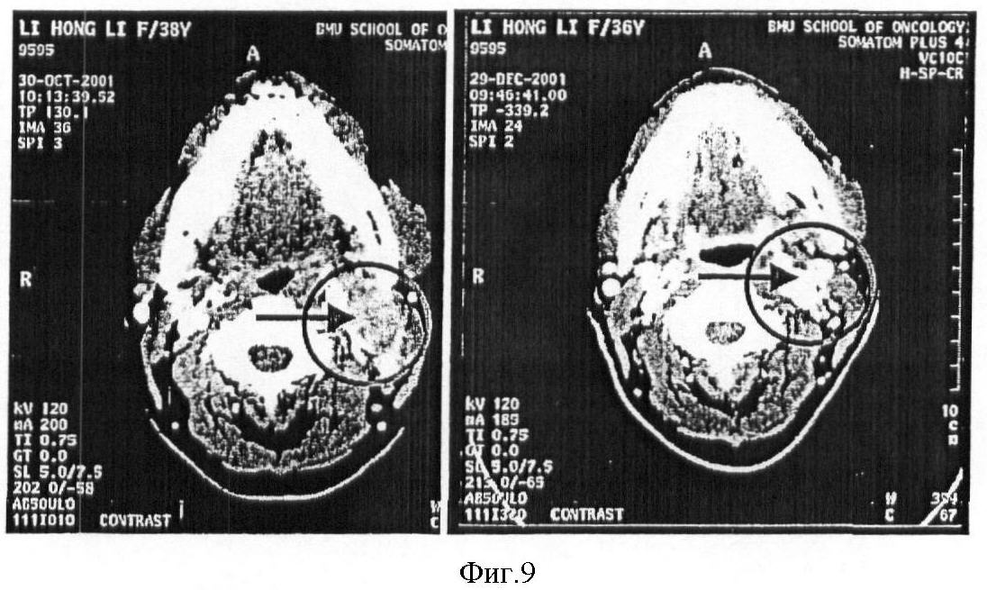 Фиг.9 (фото) представляет результаты компьютерной томографии, описывающие клинический эффект рекомбинанта р53 аденовируса при обработке им в случае рака носоглотки (фаза II). Левая фотография отражает картину до обработки, а правая – после нее (опухоль уменьшилась на 87%, отмечается некроз).