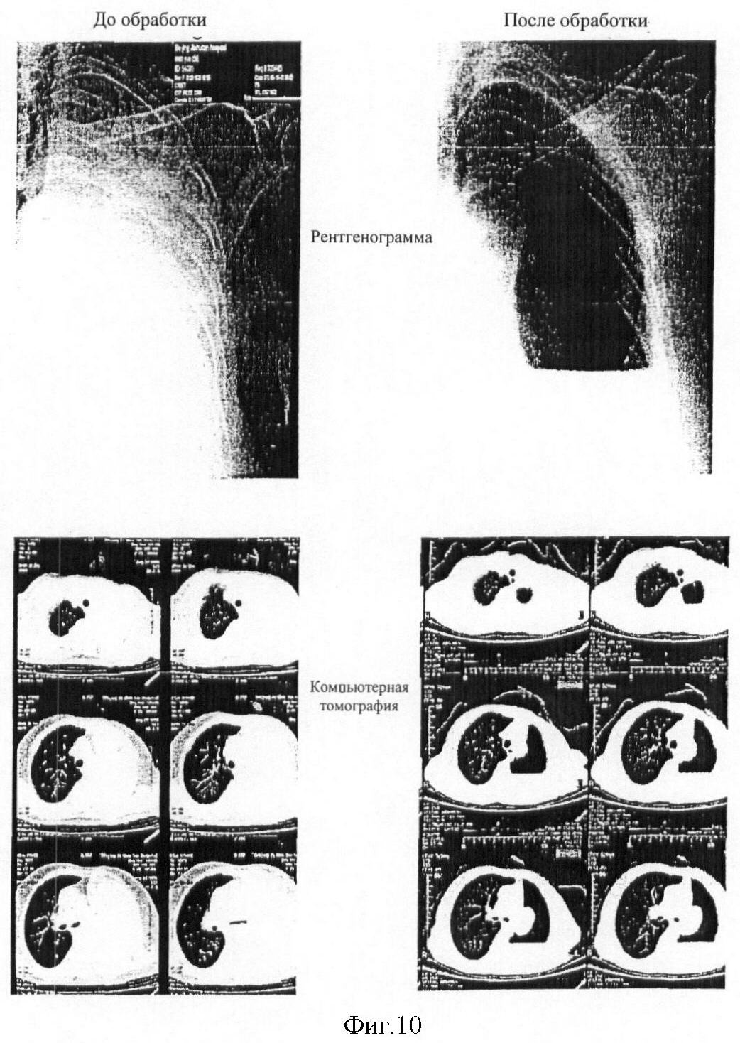 Фиг.10 (фото) представляет результаты рентгенографии (фиг.А и В) и компьютерной томографии (фиг.А и В), описывающие клинический эффект рекомбинанта р53 аденовируса при обработке им в случае рака легких (фаза II). Левые фотографии (фиг.А и С) отражают картину до обработки, а правые (фиг.В и D) – после обработки рекомбинантом р53 аденовируса в течение 1 месяца.