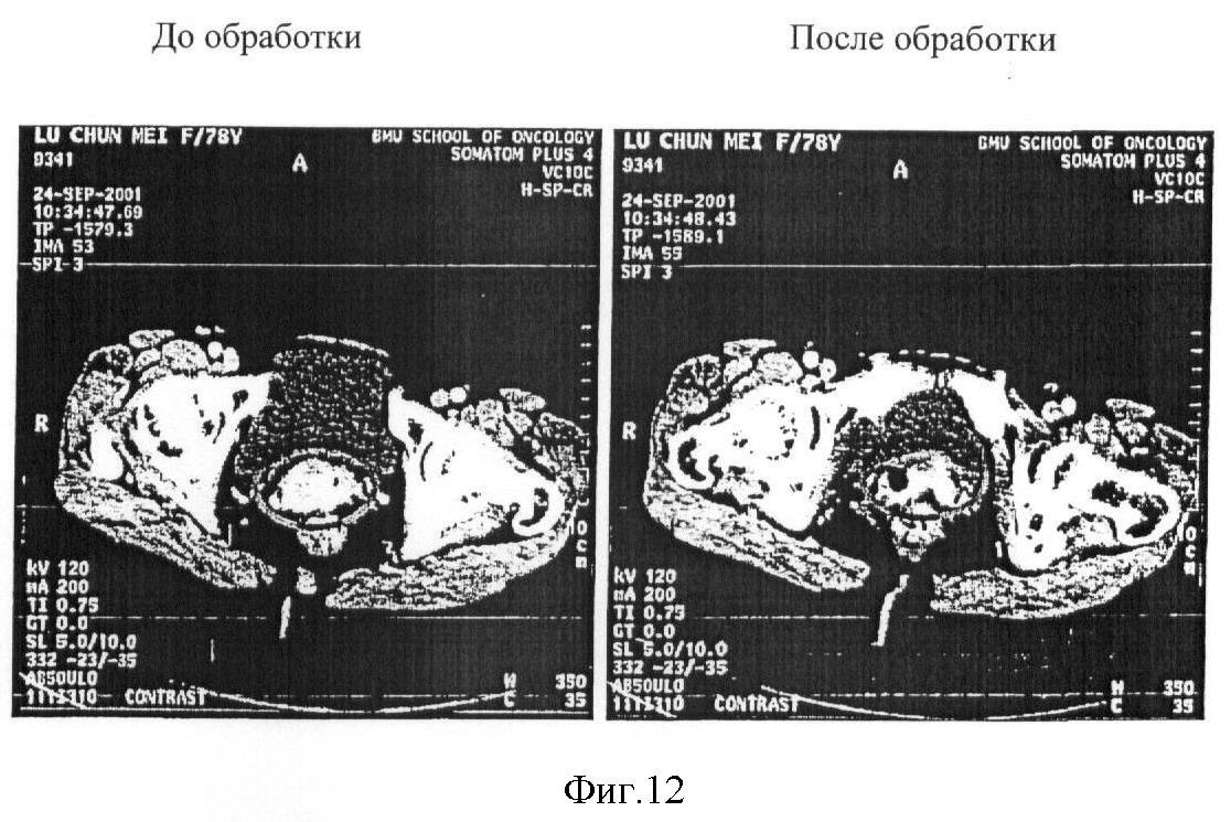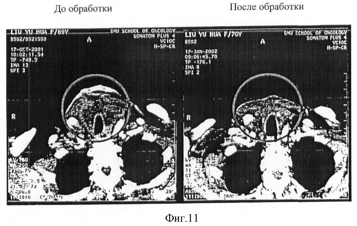 Фиг.11 (фото) представляет результаты компьютерной томографии, описывающие клинический эффект рекомбинанта р53 аденовируса при обработке им в случае рака щитовидной железы (фаза II). Левая фотография отражает картину до обработки (опухоль размером 22,5 см2 прижата к трахее), а правая – после обработки в течение 1 месяца. Отмечается уменьшение опухоли до 11,7 см2 (на 48%).