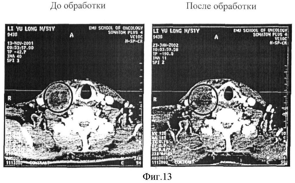 Фиг.12 (фото) представляет результаты компьютерной томографии, описывающие клинический эффект рекомбинанта р53 аденовируса при обработке им в случае карциномы шеи (фаза II). Левая фотография отражает картину до обработки (опухоль размером 30 см2), а правая – после обработки в течение 1 месяца. Опухоль уменьшилась до 3,8 см2 (на 91%), а затем исчезла.