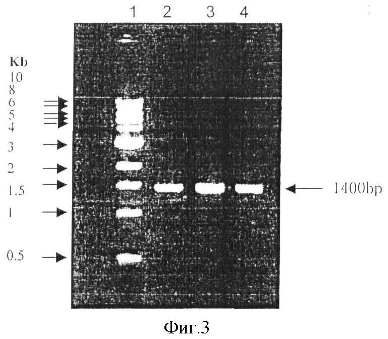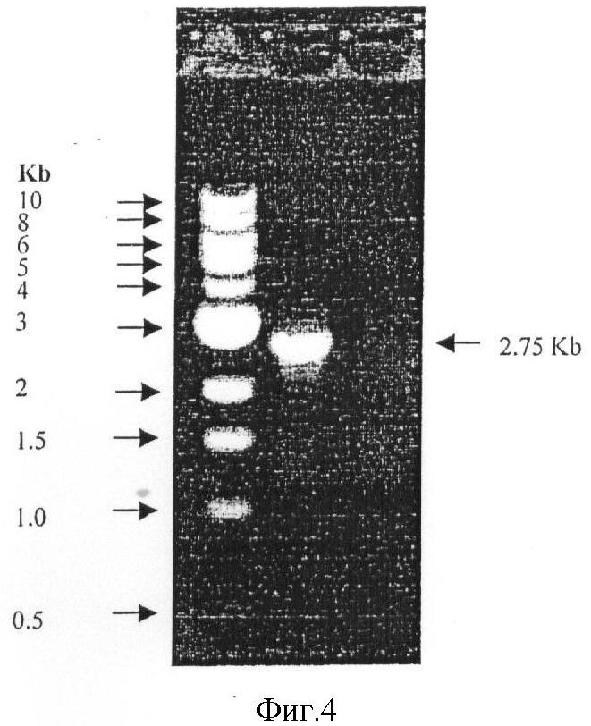 На фиг.4 приведен результат электрофореза в агарозном геле продукта амплификации ДНК вируса (р53, 2750bp), полученной из клеток, инфицированных ранее в течение 36 ч рекомбинантом р53 аденовируса (законсервирован SiBiono Company, номер хранения No-1). Цифрой 1 обозначен ДНК маркер; цифрами 2, 3, 4 – результаты ПЦР для р53 аденовируса.