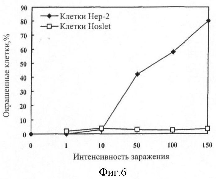 На фиг.5 приведены результаты вестерн-блоттинга (метод определения искомого белка в сложной белковой смеси) лизата клеток hep-2 и H1299 после того, как указанные клетки инфицировали рекомбинантом р53 аденовируса в течение 36 ч. Цифрой 1 обозначен белковый маркер; цифрами 2-3 – отрицательная регуляция: соответственно клетки Hep-2 и клетки H1299, не инфицированные SBN-1; 4-5 – соответственно клетки Hep-2 и клетки H1299, инфицированные SBN-1.