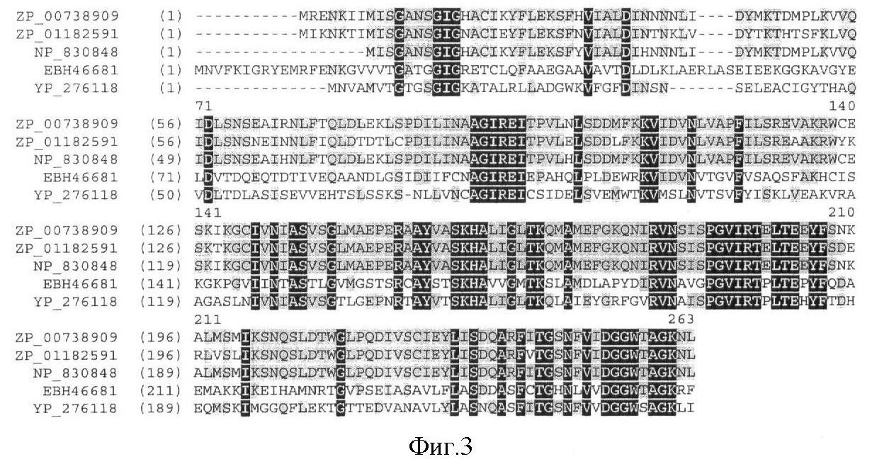 На Фиг.3 показан результат выравнивания аминокислотных последовательностей HIDH Bacillus thuringiensis serovar israelensis ATCC 35646 (ZP_00738909), короткоцепочечной дегидрогеназы/редуктазы SDR Bacillus weihenstephanensis KBAB4 (ZP_01182591), 3-оксоацил-[ацил-переносящий белок]-редуктазы Bacillus cereus ATCC 14579 (NP_830848), гипотетического белка GOS_9257808 [метагеном морского вида] (ЕВН46681) и 3-оксоацил-[ацил-переносящий белок]-редуктазы Pseudomonas syringae pv. phaseolicola 1448A(YP_276118).