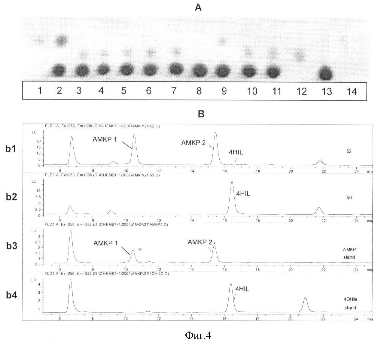 На Фиг.4 показана биоконверсия изолейцина в АМКР с использованием штама Е.coli, обладающего активностями IDO и HIDH. А – ТСХ анализ продукции АМКР. Дорожки: 1, 14 – стандартный 4HIL; 12 – стандартный АМКР; 13 – стандартный Ile; 2 – культуральная жидкость штамма TG1 [pMW119-IDO (2-е-2)]; 3-7 – культуральная жидкость штаммов TG1 [pMW119-IDO-HIDH (2-е-2)] (пять независимых клонов); 8 – культуральная жидкость штамма TG1 [pMW119]; 9- культуральная жидкость штамма TG1 [pMW119-IDO(VKPM В-197)]; 10-11 – культуральная жидкость штаммов TG1 [pMW119-IDO-HIDH (VKPM В-197)] (два независимых клона). В – ВЭЖХ анализ продукции АМКР. b1 – культуральная жидкость штамма TG1 [pMW119-IDO-HIDH (2-е-2)]; b2 – культуральная жидкость штамма TG1 [pMW119-IDO (2-е-2)]; b3 – стандартный АМКР; b4 – стандартный 4HIL.