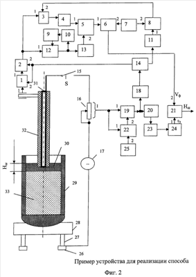 На фиг.2 обозначено: 1- датчик положения; 2 – цифроаналоговый преобразователь; 3, 12, 18, 19 – ключи; 4, 13 – блоки памяти; 5 – вычитатель; 6 – делитель; 7, 25 – задатчики; 8, 10, 22 – компаратор; 9 – RS-триггер; 11 – счетчик времени; 14 – генератор тактовых импульсов; 15 – выключатель; 16 – переменный резистор (сопротивление нагрузки); 17 – источник постоянного тока; 20 – фильтр; 21 – умножитель; 23 – дифференциатор; 24 – экстремальный регулятор; 26 – рельс; 27 – колесо; 28 – телега сталевоза; 29 – ковш со сталью (и шлаком); 30 – расплав шлака; 31 – металлическая труба; 32 – погружная фурма; 33 – расплав стали.