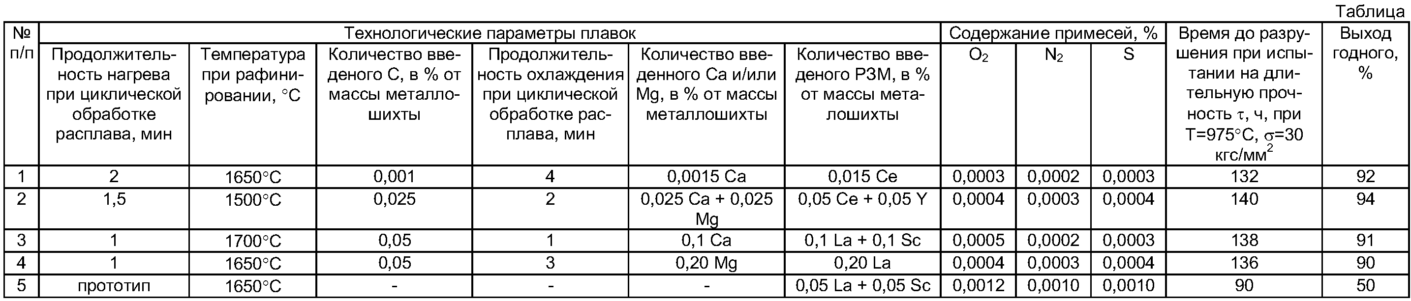 – время до разрушения, ч, при испытании на длительную прочность) и выходу годного отливок приведены в таблице. Там же приведены технологические параметры плавки по способу-прототипу и полученные результаты.