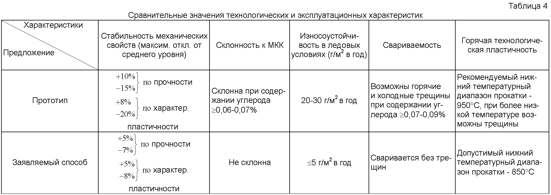 При данных условиях по легированию основными элементами и ограничения содержания примесных элементов большое значение для обеспечения требуемых характеристик при их стабильных значениях имеет пониженное содержание углерода. При его стабильном содержании ниже 0,06% обеспечивается более равномерная структура без выделения грубодисперсных карбидных фаз, в основном содержащих хром. Это способствует стабилизации характеристик механических свойств, подавлению межкристаллитной коррозии и, соответственно, повышению износоустойчивости в ледовых условиях, улучшению свариваемости и повышению горячей пластичности (сравнительные данные по этим параметрам представлены в табл. 4).