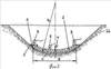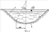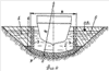 При возведении фундамента дока на песчано-гравийном фильтре 6 в днище 2 предусмотрена установка аварийных сливных трубок 4 для снятия избыточного противодавления, возникающего в случае кольматации фильтра вблизи места установки насосов или повреждения последних. Это противодавление должно быть снято с днища с помощью сливных трубок 4 еще до того, как возникает опасность его взлома. Длина этих трубок 4 выбирается в соответствии с величиной допускаемого в данном случае противодавления. Другой способ борьбы с противодавлением на днище 2 состоит в его анкеровке в толще подстилающего, например, торфяного основания с помощью часто расположенных свай, что важно для передачи нагрузки при заполнении дока водой на его основание. Эти же сваи предотвращают док от всплывания при его опорожнении, а также увеличивают вес днища дока, воспринимающего противодавление, на величину веса грунта, находящегося вокруг свай, при этом сваи следует забивать на глубину h в основание также по дуге окружности Rcв.=R+h.
